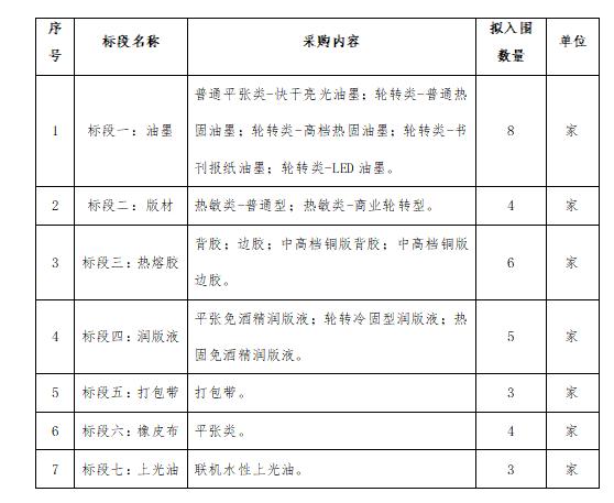 三、征集項目簡介:本項目征集人為中南出版?zhèn)髅郊瘓F股份有限公司(以下簡稱“征集人”),湖南省印刷物資有限責任公司(以下簡稱“采購人”)根據(jù)征集結(jié)果實施采購,承擔框架協(xié)議和采購合同的簽訂與執(zhí)行。本次采購范圍為主要印刷輔料,涵蓋油墨、版材、熱熔膠、潤版液、打包帶、橡皮布、上光油七大類,劃分為7個標段。若某標段通過資格審查的供應商數(shù)量小于擬入圍家數(shù),為保證項目競爭性,推薦入圍供應商數(shù)量縮減為N-1,其中N是指通過資格符合性審查的供應商的數(shù)量,征集人也有權針對該標段重新組織采購。具體標段劃分如下:
