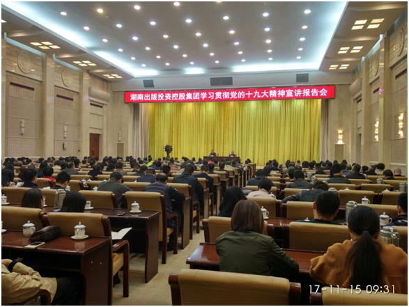 11月15日上午,湖南出版投資控股集團(tuán)學(xué)習(xí)貫徹黨的十九大精神宣講報(bào)告會(huì)在九所賓館會(huì)議中心舉行。黨的十九大代表、湖南新聞出版廣電局黨組書(shū)記朱建綱應(yīng)邀作輔導(dǎo)報(bào)告,集團(tuán)黨委書(shū)記、董事長(zhǎng),中南傳媒董事長(zhǎng)龔曙光主持會(huì)議。集團(tuán)黨委領(lǐng)導(dǎo)、中南傳媒高管、子分公司全體集團(tuán)管理干部、控股集團(tuán)和中南傳媒總部員工共300余人參加會(huì)議。